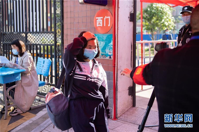 4月13日,在長沙寧鄉(xiāng)市長郡溈東中學(xué),學(xué)生進(jìn)入學(xué)校時(shí)接受體溫測量。新華社發(fā)(陳思汗 攝)