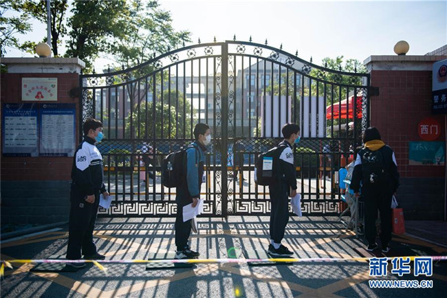 4月13日,在長沙寧鄉(xiāng)市長郡溈東中學(xué)門口,學(xué)生排隊(duì)進(jìn)入校園。新華社發(fā)(陳思汗 攝)