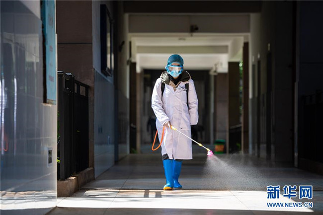4月13日,在長沙寧鄉(xiāng)市長郡溈東中學(xué),校醫(yī)在校內(nèi)噴灑消毒液。新華社發(fā)(陳思汗 攝)