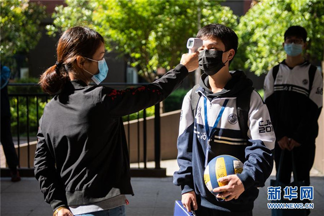 4月13日,在長沙寧鄉(xiāng)市長郡溈東中學(xué),學(xué)生進(jìn)入宿舍前接受體溫測量。新華社發(fā)(陳思汗 攝)