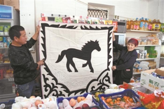 4月14日,在新疆托里縣多拉特鄉(xiāng)加瑪特村電子商務服務點負責人劉志江(左)與貧困戶馬合甫扎·阿勒木賽依提一起展示銷售的產(chǎn)品。 新華社記者 沙達提 攝