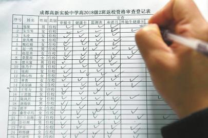 成都高新實(shí)驗(yàn)中學(xué)工作人員對(duì)高2018級(jí)2班學(xué)生進(jìn)行返校資格審查登記。