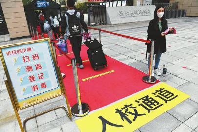 成都市教科院附中高一年級(jí)學(xué)生通過(guò)入校通道有序返校。