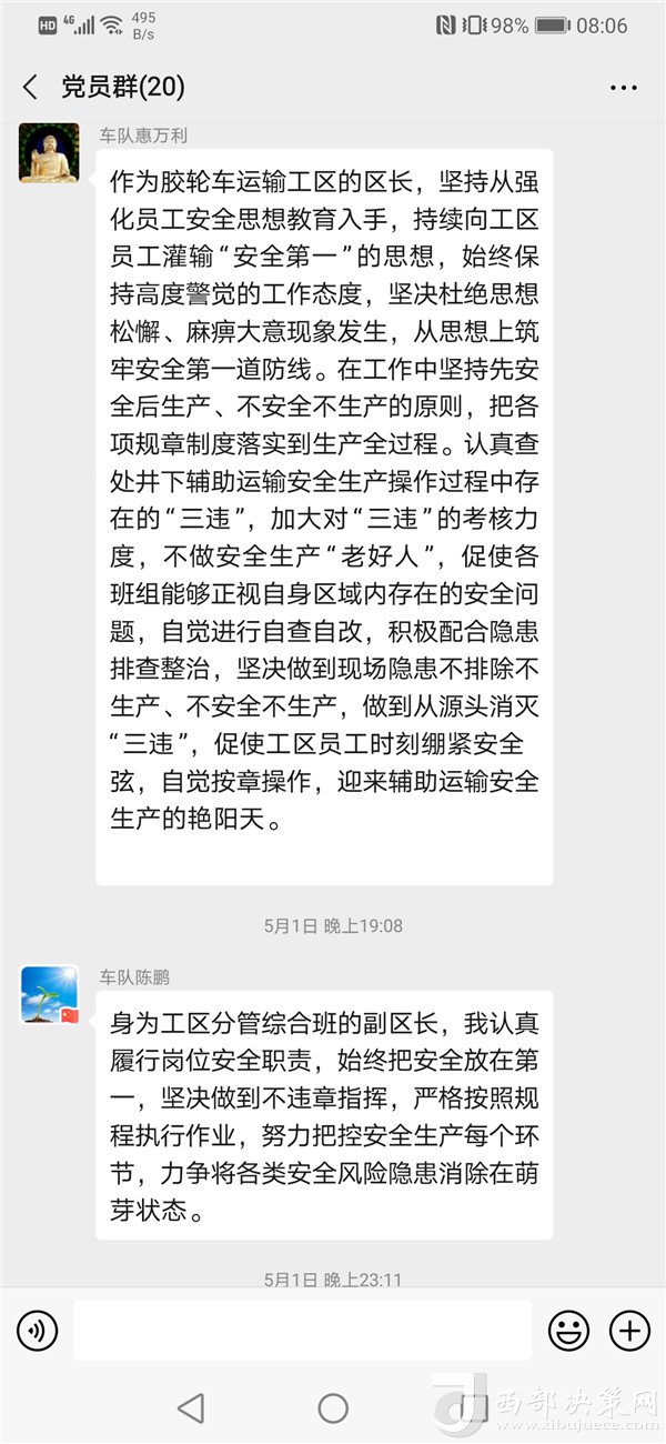 西部決策網(wǎng)訊(記者王瑞鵬 通訊員 張亞濤)為更好地發(fā)揮基層黨支部戰(zhàn)斗堡壘作用、廣大黨員先鋒模范作用,5月份,陜北礦業(yè)檸條塔公司膠輪車運(yùn)輸工區(qū)開展“講安全、抓安全”主題黨日活動(dòng)。該支部按照“全員學(xué)習(xí)、座談?dòng)懻?、結(jié)合崗位實(shí)際”的學(xué)習(xí)方式,全面深入開展“吸取教訓(xùn)、查擺問題、整改落實(shí)、確保安全”主題黨日活動(dòng)。