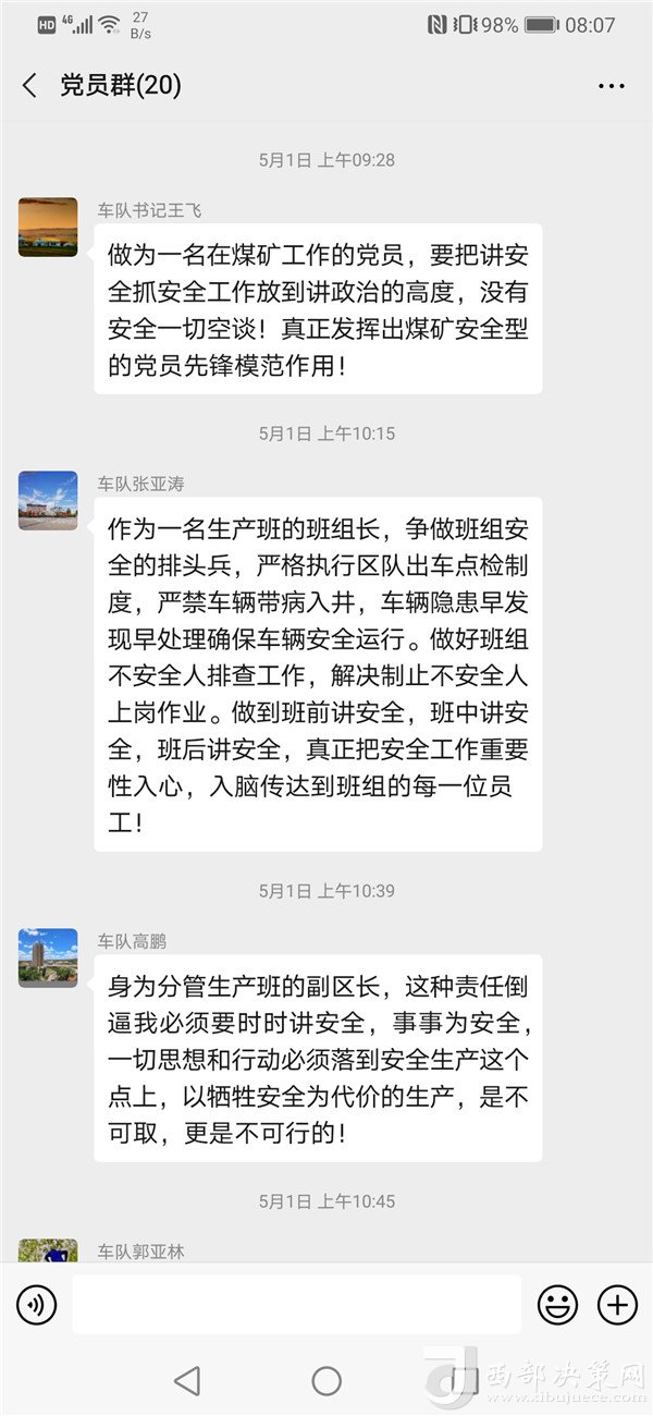 活動(dòng)期間,支部20名黨員認(rèn)真學(xué)習(xí)貫徹集團(tuán)公司、陜北礦業(yè)公司和公司近期安全生產(chǎn)文件材料宣貫落實(shí)精神,深刻吸取安全生產(chǎn)事故教訓(xùn),圍繞“守住安全生產(chǎn)這一‘生命線’,牢固確立‘四個(gè)最’的意識”工作目標(biāo),展開了圍繞分管業(yè)務(wù)、自身崗位特點(diǎn)的討論學(xué)習(xí)。此次主題黨日活動(dòng),支部黨員紛紛談體會(huì)、講心得,結(jié)合工作中遇到的經(jīng)典案例,剖析了自身工作存在的短板和不足,并提出了具體的改進(jìn)措施。同時(shí),表示在今后工作中將充分發(fā)揮黨員的先鋒模范作用,擔(dān)當(dāng)作為、履職盡責(zé),做到帶頭反三違、帶頭降三違、身邊無三違。