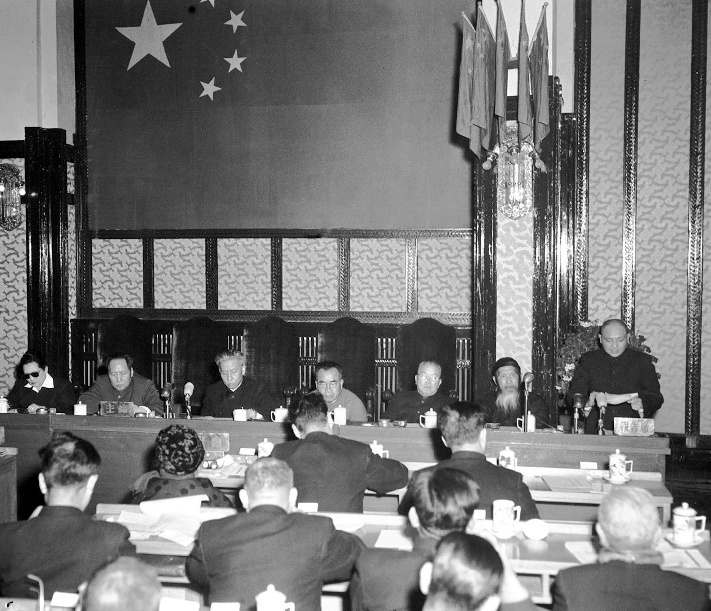 1953年2月11日,中央人民政府委員會舉行第二十二次會議。鄧小平(右一)在會議上作關(guān)于中華人民共和國全國人民代表大會及地方各級人民代表大會選舉法的說明報告。主席臺上(自左起)宋慶齡副主席,毛澤東主席,劉少奇、朱德、李濟(jì)深、張瀾副主席。