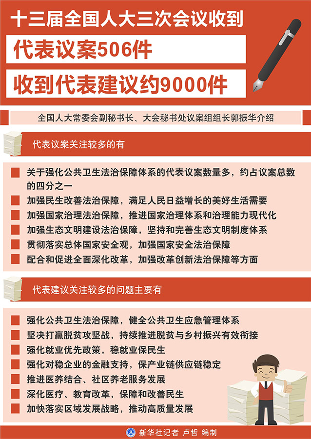 全國(guó)人大常委會(huì)副秘書(shū)長(zhǎng)、大會(huì)秘書(shū)處議案組組長(zhǎng)郭振華介紹,今年一個(gè)突出特點(diǎn)是關(guān)于強(qiáng)化公共衛(wèi)生法治保障體系的代表議案數(shù)量多,約占議案總數(shù)的四分之一。圍繞加快構(gòu)建疫情防控法律體系,提出修改傳染病防治法、刑法、治安管理處罰法,加大對(duì)瞞報(bào)傳染病、妨礙防疫工作及非法獵殺、銷(xiāo)售、食用野生動(dòng)物等行為的處罰力度,修改中醫(yī)藥法、執(zhí)業(yè)醫(yī)師法、獻(xiàn)血法,以及制定公共衛(wèi)生安全保障等方面的法律。圍繞健全國(guó)家公共衛(wèi)生應(yīng)急管理體系,提出修改突發(fā)事件應(yīng)對(duì)法、價(jià)格法、慈善法,制定社會(huì)救助法以及戰(zhàn)略物資儲(chǔ)備、行政征用、信息公開(kāi)、社區(qū)應(yīng)急管理、現(xiàn)場(chǎng)救護(hù)等方面的法律。圍繞構(gòu)建國(guó)家生物安全法律法規(guī)體系,提出修改野生動(dòng)物保護(hù)法、動(dòng)物防疫法、食品安全法、漁業(yè)法,制定生物安全法等法律。