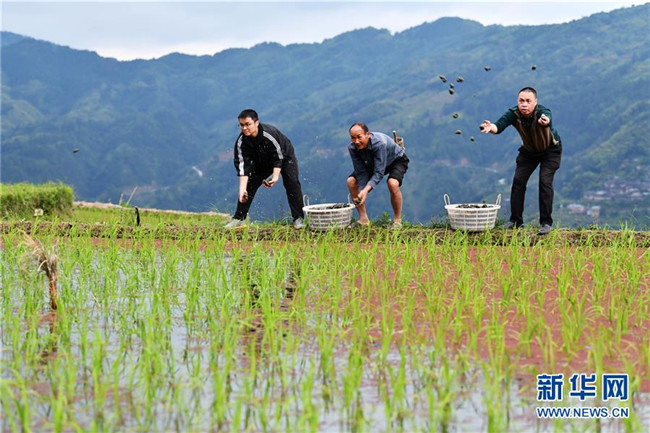 5月26日,貴州省黔東南州住建局派駐從江縣加榜鄉(xiāng)加車村的幫扶干部(左一、右一)幫助村民一起播撒種螺。