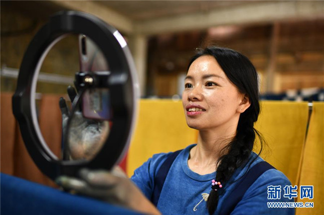 楊成蘭在用手機(jī)對侗族土布植物染色技藝進(jìn)行網(wǎng)絡(luò)直播(5月28日攝)。新華社記者 楊文斌 攝