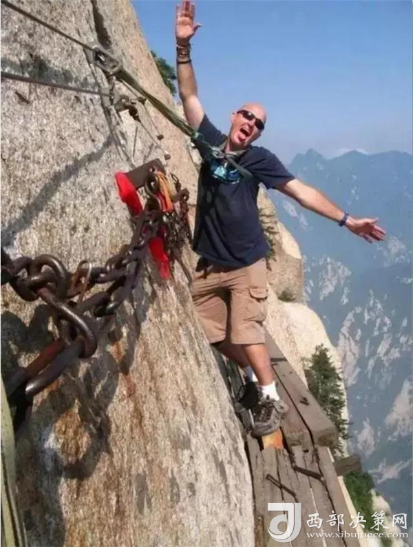 喜歡攀巖徒步,似乎是很多老外的一種標(biāo)志性運(yùn)動。幾個(gè)熱愛徒步攀巖的老外,在華山的棧道上擺pose,挑戰(zhàn)這種世界上最危險(xiǎn)的徒步棧道。