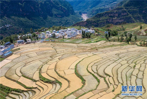 6月24日,金沙江邊的四川省布拖縣拉果鄉(xiāng)偉木村安全住房依山而建錯(cuò)落有致(無(wú)人機(jī)照片)。新華社記者江宏景攝