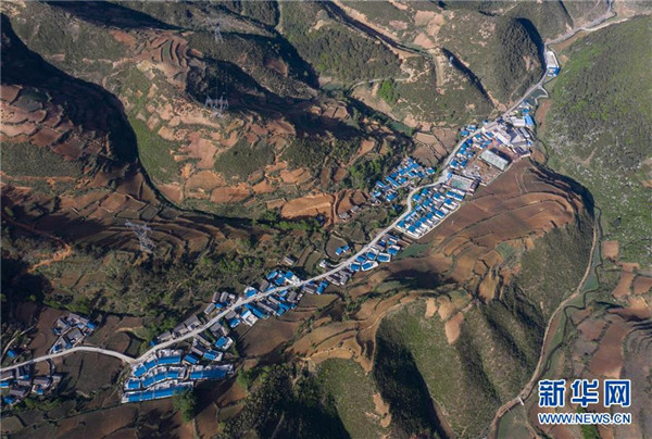 俯瞰群山中的四川省布拖縣烏科鄉(xiāng)洛呷村集中安置點(diǎn)(5月17日攝,無(wú)人機(jī)照片)。新華社記者江宏景攝