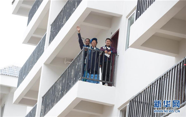 6月21日,在四川省布拖縣縣城易地扶貧搬遷集中安置點(diǎn)(依撒社區(qū)),來(lái)自特木里鎮(zhèn)乃烏村的社也小黑一家在新居招手。新華社記者江宏景攝