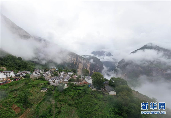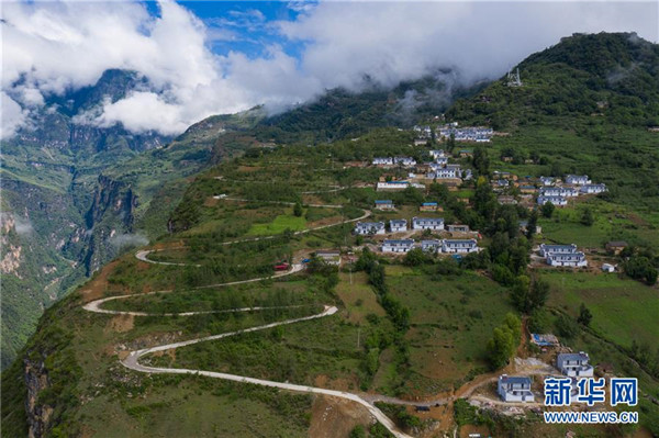 6月24日,懸崖邊的四川省布拖縣拉果鄉(xiāng)布歪村安全住房依山而建錯(cuò)落有致(無(wú)人機(jī)照片)。新華社記者江宏景攝