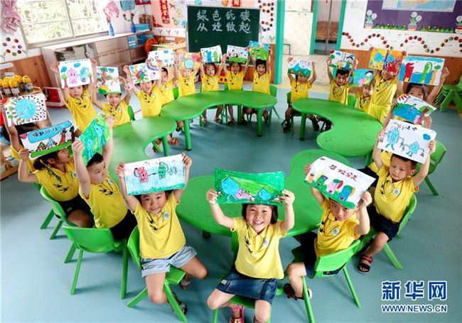 7月2日,湖南省漣源市橋頭河鎮(zhèn)新培童心幼兒園的小朋友展示手繪的低碳環(huán)保作品。新華社發(fā)(張揚攝)