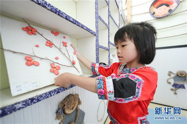 7月2日,在貴州省銅仁市玉屏侗族自治縣,皂角坪幼兒園的小朋友展示自制的綠色環(huán)保作品。 新華社發(fā)(胡攀學(xué)攝)