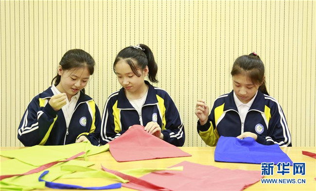 7月2日,河北省廣宗縣第一中學(xué)學(xué)生手工縫制環(huán)保手提袋。新華社發(fā)(張馳攝)