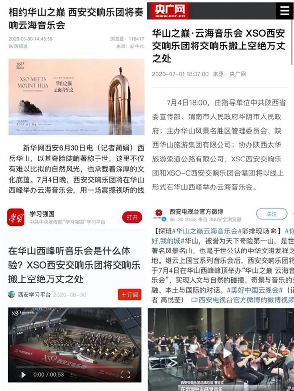 本場華山之巔·云海音樂會(huì)通過央視新聞、央視頻、央視音樂、B站、中新網(wǎng)、人民視頻、愛奇藝隨刻、愛滿地古典音樂頻道、西安發(fā)布、西安臺(tái)、華商網(wǎng)、西部網(wǎng)、咪咕音樂、焦糖、西影視頻等平臺(tái)進(jìn)行了同步播放。全網(wǎng)首輪播放量5千萬+。