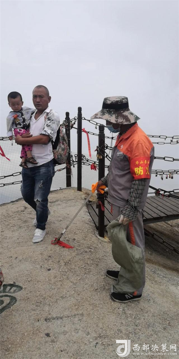 因為長時間彎腰撿拾垃圾,楊群社的脊背被太陽曬得火燒一樣疼,眼睛被光禿禿、白花花的華山花崗巖反射回來的太陽光刺得發(fā)澀暈眩。脊背燒得難忍時,楊群社就找一個有風(fēng)的方向吹一吹;頭暈得厲害時,楊群社用手揉一揉太陽穴、掐一掐鼻梁。