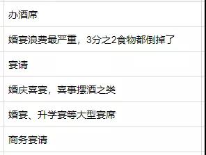 在調(diào)查問卷的后臺留言中,不少受訪者留言說,同學會、紅白宴、生日宴、升學宴、商務(wù)宴請等浪費量較高,甚至有人說“三分之二的食物都倒掉了”。