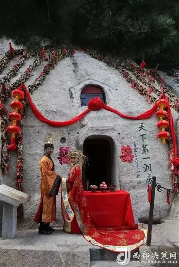相傳春秋時期在華山修行的吹簫人簫史和秦穆公的女兒弄玉就是在華山西峰鑿洞成婚,“洞房”一詞由此誕生。天下第一洞房位于華山西峰東側半腰,從蓮花橋經(jīng)十八譚登山路的左側即達,多少年來,一對對相濡以沫的夫妻,一雙雙初次相識的戀人,攜手并肩,登頂華山,汲西峰洞房瑞氣,沐東峰朝陽祥光,恩恩愛愛漫步人生幸福路。