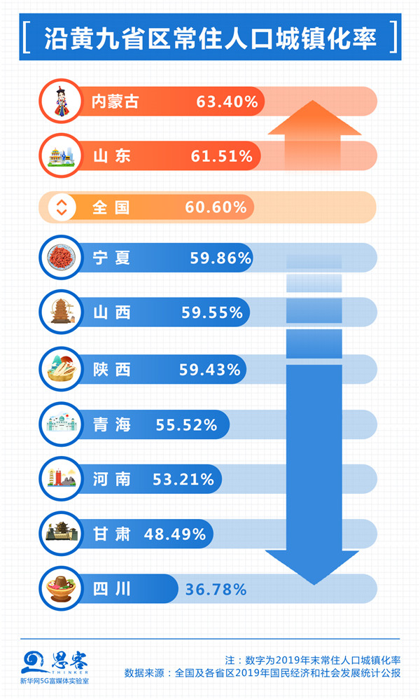 鄭州、西安、濟南等中心城市和中原等城市群帶動區(qū)域內(nèi)城市及城市群加快建設,但目前九省區(qū)城鎮(zhèn)化水平及中心城市輻射帶動能力仍有待提升。沿黃九省區(qū)僅有內(nèi)蒙古和山東的常住人口城鎮(zhèn)化率高于全國平均水平。從中心城市看,流域內(nèi)鄭州和西安的地區(qū)生產(chǎn)總值在九大國家中心城市中處在相對較后的位置。西寧、蘭州、銀川等首位度相對較高的省會城市輻射帶動能力也有限。