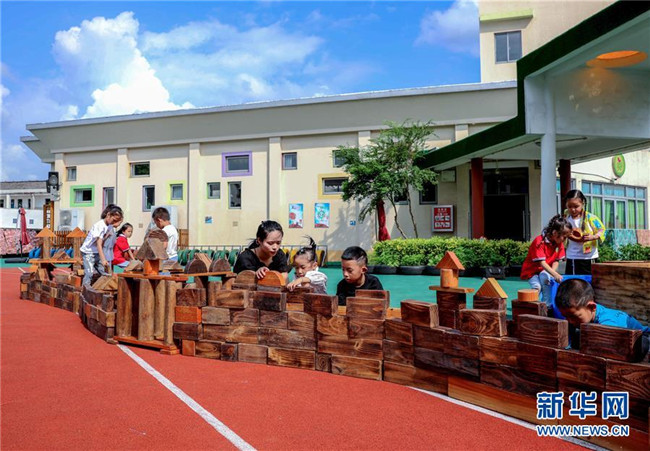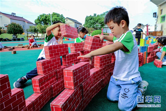 9月28日,孩子們?cè)诖罱?ldquo;萬里長(zhǎng)城”。新華社記者 徐昱 攝