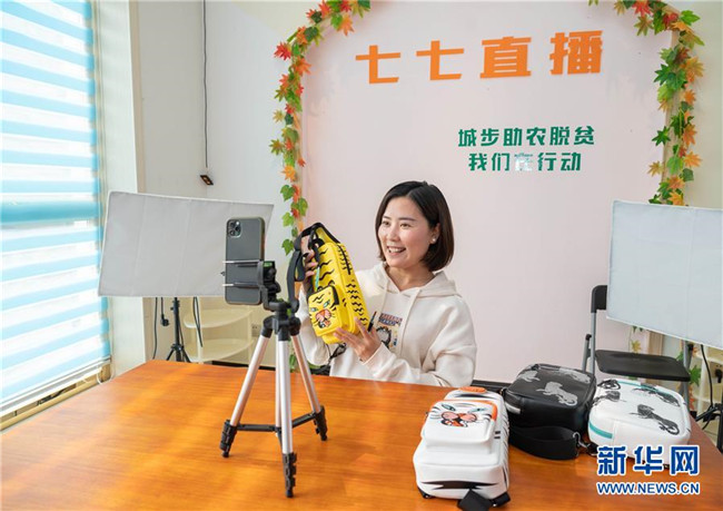 10月13日,在湖南省邵陽市城步縣湖南七七科技股份有限公司,殘疾女青年楊淑亭通過網(wǎng)絡(luò)銷售背包。1991年出生的苗族姑娘楊淑亭因車禍胸部以下高位截癱,通過不斷學(xué)習(xí)摸索,開辦網(wǎng)店并注冊了自己的企業(yè),與周邊貧困家庭簽訂合作協(xié)議,制作售賣具有民族特色的背包和仿真花卉,帶動(dòng)上千名貧困人員及59名殘疾人就業(yè)。