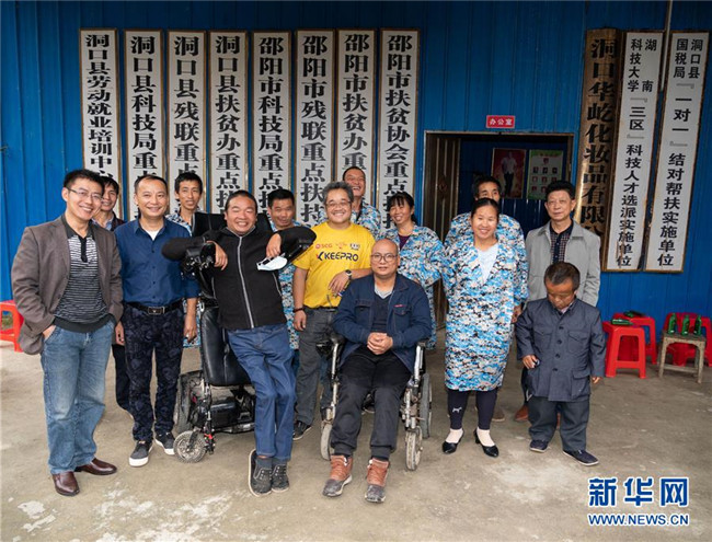 10月13日,在湖南省邵陽市洞口縣華屹化妝品有限公司,殘疾人張赫倫(左五)與他的伙伴們合影留念。42歲的張赫倫在1998年因強(qiáng)直性脊柱炎致一級(jí)殘疾,失去生活自理能力。他通過生產(chǎn)洗發(fā)水致富,主動(dòng)吸納18名殘疾人就業(yè),還以“基地+農(nóng)戶”模式帶動(dòng)50多戶貧困戶脫貧致富。