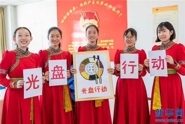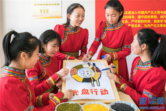 15日,內(nèi)蒙古呼和浩特市第二十六中學(xué)學(xué)生展示“光盤行動(dòng)”趣味糧食貼畫。新華網(wǎng)發(fā)(丁根厚攝)