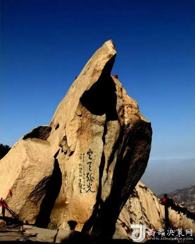 華山的美是“他”昂揚風(fēng)姿、冠絕五岳的那份傲氣。華山的韻是“他”看不盡、摸不透的那份神秘。就在這萬般火熱而五彩的氛圍中,就在這千百年的磨礪里,兩塊佇立在山中的一大一小的巨石更引起了探秘者的好奇和興趣。
