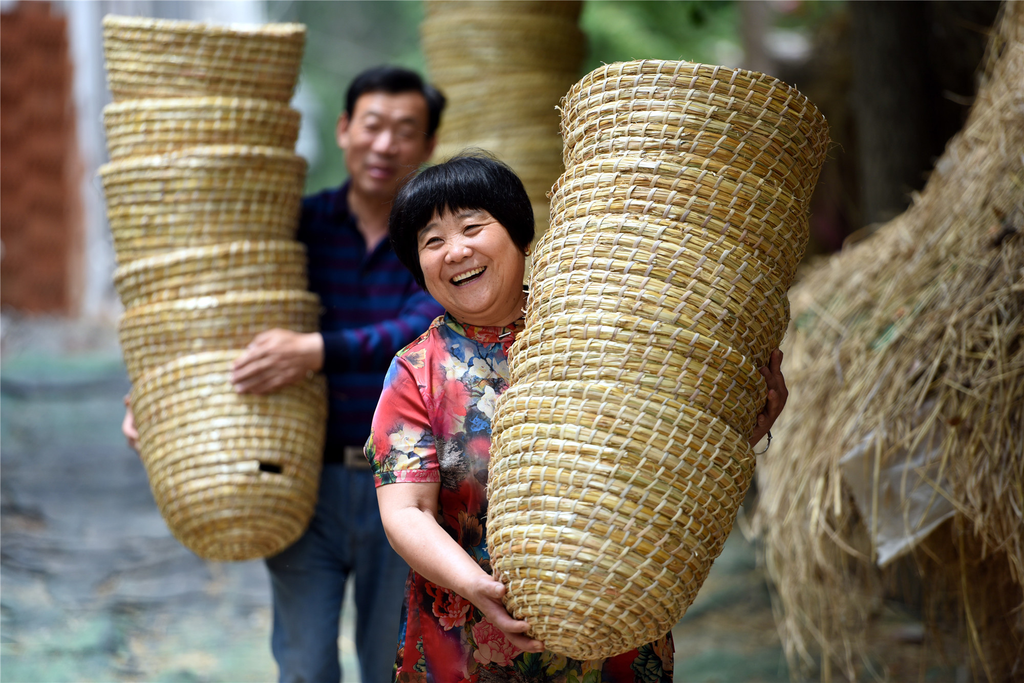 山東省臨沂市郯城縣馬頭鎮(zhèn)草編合作社社員在搬運(yùn)用秸稈編制的工藝品(2019年5月28日攝)。新華社發(fā)(房德華 攝)