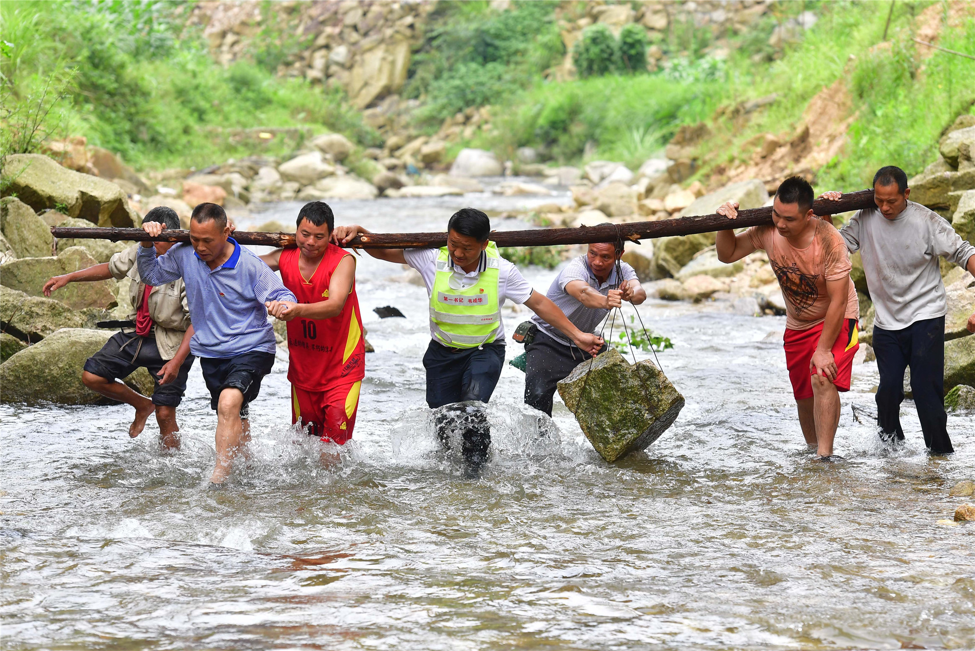 在位于黔桂交界大苗山深處的烏英苗寨,駐村第一書(shū)記韋桂華(右四)、黨員梁成兵(右三)、梁志新(左二)帶領(lǐng)村民維修河堤(2019年6月30日攝)。新華社記者 黃孝邦 攝