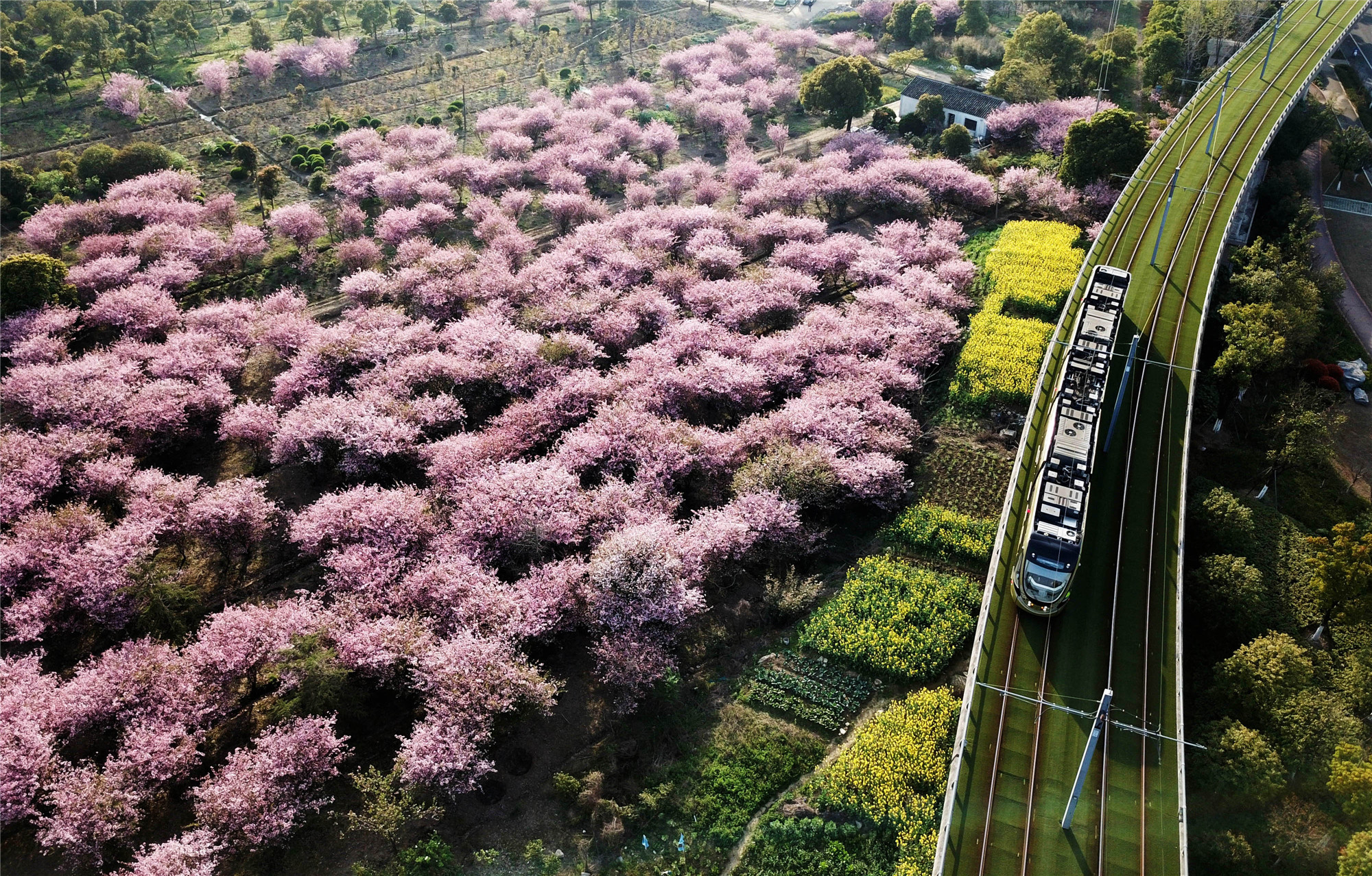 在江蘇蘇州高新區(qū),一輛有軌電車(chē)從一片盛開(kāi)的垂絲海棠旁駛過(guò)(2018年3月28日攝)。新華社發(fā)(徐志強(qiáng) 攝)