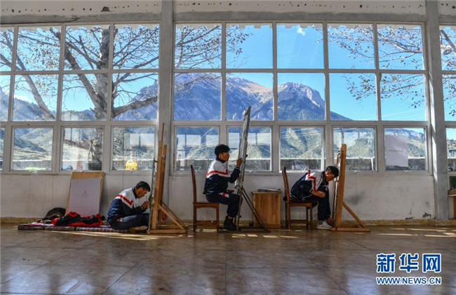 在西藏昌都市卡若區(qū)嘎瑪鄉(xiāng)的民族手工藝培訓基地,學員們在學習畫唐卡(10月3日攝)。新華社記者 晉美多吉 攝