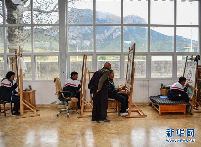 嘎瑪?shù)吕绽先嗽谖鞑夭际锌ㄈ魠^(qū)嘎瑪鄉(xiāng)的民族手工藝培訓基地里教學員們畫唐卡(10月3日攝)。新華社記者 晉美多吉 攝