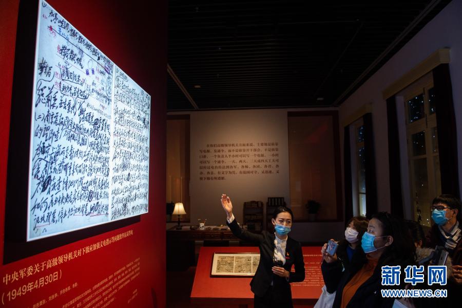 “毛澤東同志香山時期發(fā)布電報手稿專題展覽”在北京香山革命紀念館開展,講解員(左一)向媒體記者介紹電報內(nèi)容(2020年12月16日攝)。新華社記者 陳鐘昊 攝