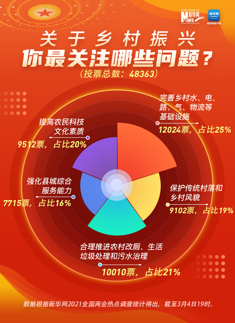 其中,“完善鄉(xiāng)村水、電、路、氣、物流等基礎設施”、“合理推進農村改廁、生活垃圾處理和污水治理”、“提高農民科技文化素質”位列子選項前三位,成為大家關注的焦點。如何推進更多、更具體的鄉(xiāng)村振興支持政策,如何突破戶籍制度等領域改革,如何完善城鄉(xiāng)一體化發(fā)展的體制機制、推動農業(yè)農村現(xiàn)代化邁好“十四五”第一步,成為代表委員的重要關切。