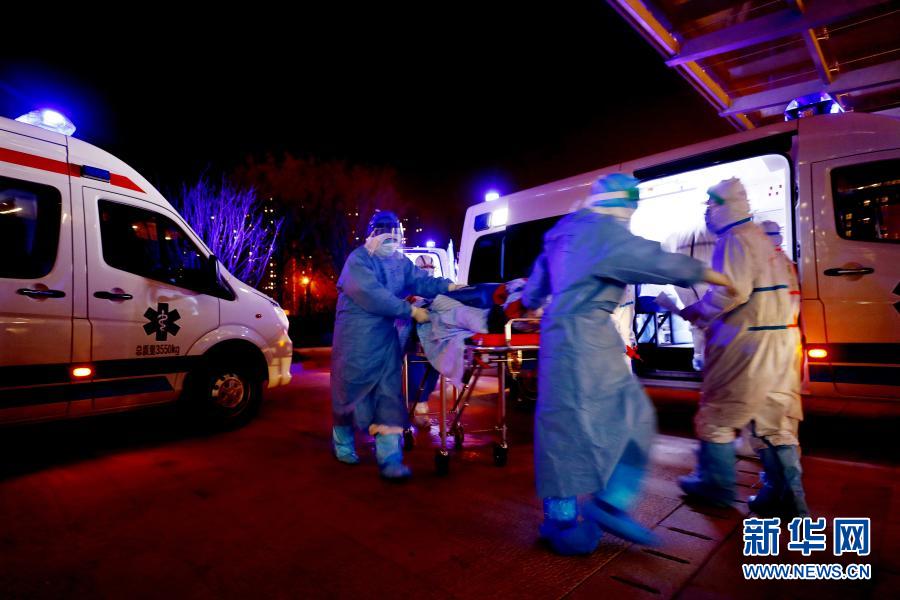 在武漢泰康同濟醫(yī)院接診大廳外,軍隊支援湖北醫(yī)療隊隊員接收轉(zhuǎn)運來的患者(2020年3月14日攝)。新華社發(fā)(王皓宇 攝)