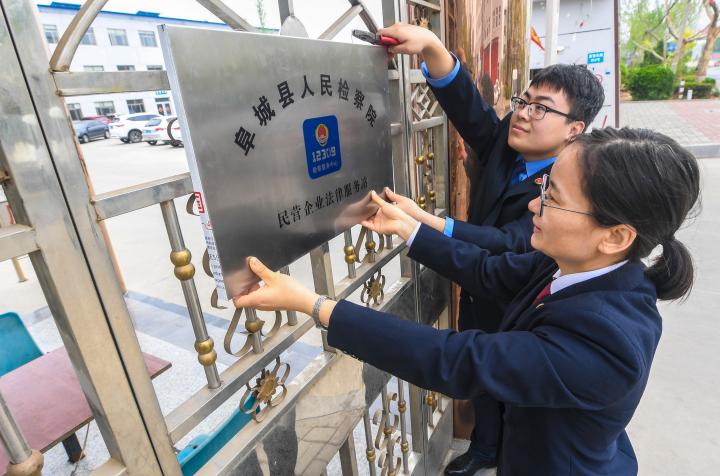 2019年4月23日,河北省阜城縣人民檢察院檢察官在一家企業(yè)門口掛“民營企業(yè)法律服務(wù)站”的牌子,為經(jīng)濟發(fā)展履行保駕護航職責。新華社記者李曉果攝