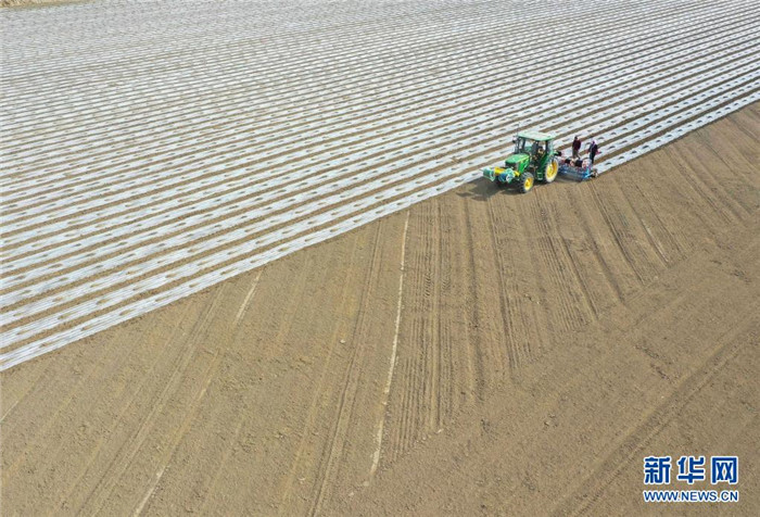在新疆尉犁縣塔里木鄉(xiāng)英努爾村,農(nóng)民駕駛大馬力拖拉機在棉田里進行鋪膜作業(yè)(3月28日攝)。新華社發(fā)(汪志鵬 攝)