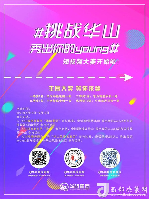 朝氣蓬勃的青年學(xué)生擁有敏銳的感受力和發(fā)現(xiàn)美的能力。為了進(jìn)一步挖掘華山獨(dú)特自然風(fēng)光及厚重的文化內(nèi)涵,激發(fā)大學(xué)生群體的創(chuàng)作才能,華旅集團(tuán)營(yíng)銷(xiāo)中心特向大學(xué)生推出“挑戰(zhàn)華山 秀出你的young”短視頻大賽,在比賽之余,可圍繞華山自然風(fēng)光、人文歷史、傳說(shuō)典故、道教文化等進(jìn)行創(chuàng)作,以年輕人的視角展示華山獨(dú)特之美,活動(dòng)自4月10日起,在微信視頻號(hào)(華山景區(qū))、抖音APP(華山)、嗶哩嗶哩(華山風(fēng)景名勝區(qū))等平臺(tái)正式啟動(dòng)。