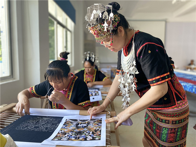 在技藝恢復的過程中,郭凱的團隊也有意外的收獲。通過對三聯(lián)幅、五聯(lián)幅龍被的復制,恢復傳統(tǒng)龍被織造技藝,對黎錦傳統(tǒng)技藝的傳承與發(fā)展具有重要意義;通過對龍被的原材料使用和織造技藝(包括紡染織繡各項技藝)過程編輯形成圖文資料,拍攝形成影像資料,為龍被技藝的保護、傳承與發(fā)展留下了寶貴的資料和傳播素材;通過開辦龍被刺繡技能培訓班,培養(yǎng)了一批刺繡人才,使越來越多的人群能夠掌握傳統(tǒng)特色一技之長,繼而產(chǎn)生富有民族特色的經(jīng)濟效益和社會效益,更大程度地傳承民族技藝,并將其發(fā)揚光大。