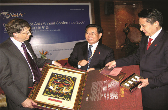 時任海南省委書記衛(wèi)留成、省長羅保銘向微軟公司董事長比爾.蓋茨贈送黎錦禮品