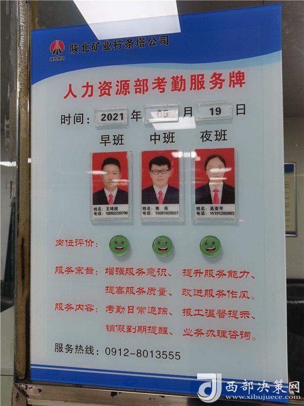 西部決策網(wǎng)訊 在黨史學(xué)習(xí)教育活動中,開展“我為群眾辦實(shí)事”實(shí)踐活動是公司黨史學(xué)習(xí)教育實(shí)施方案中的一項(xiàng)重點(diǎn)任務(wù)。為及時(shí)了解和掌握員工考勤動態(tài),妥善處理和解決好員工考勤中的難點(diǎn)問題,增強(qiáng)員工獲得感、幸福感、安全感,陜北礦業(yè)檸條塔公司人力資源部結(jié)合實(shí)際,把學(xué)黨史與為員工辦實(shí)事相結(jié)合,增設(shè)一面“考勤服務(wù)牌”。