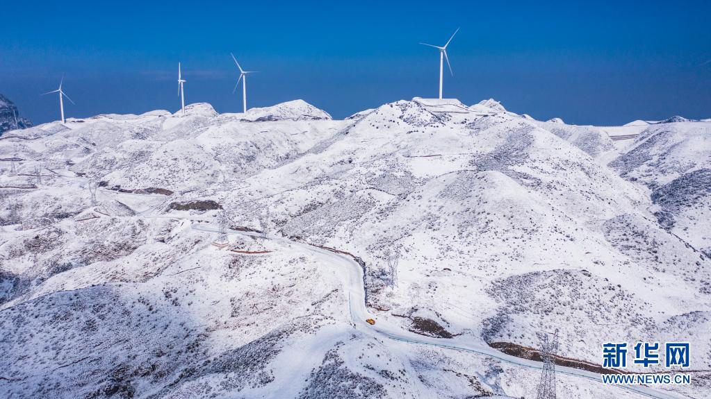 雪后的六盤水市盤州四格風(fēng)電場(1月12日攝,無人機(jī)照片)。新華社記者 陶亮 攝