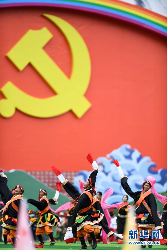 8月4日,當(dāng)?shù)厝罕娫谟駱?shù)藏族自治州成立70周年慶祝大會(huì)上表演節(jié)目。新華社記者 吳剛 攝