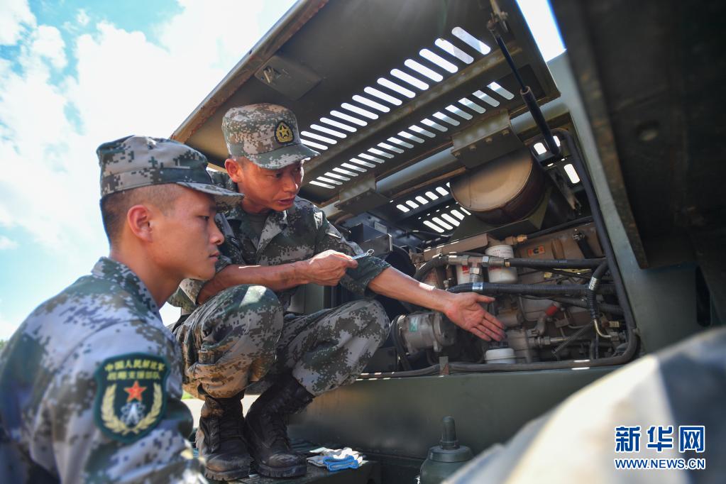 戰(zhàn)略支援部隊某大隊一級軍士長高玉華(右)現(xiàn)場指導排除工程機械故障(7月23日攝)。新華社記者 陳澤國 攝