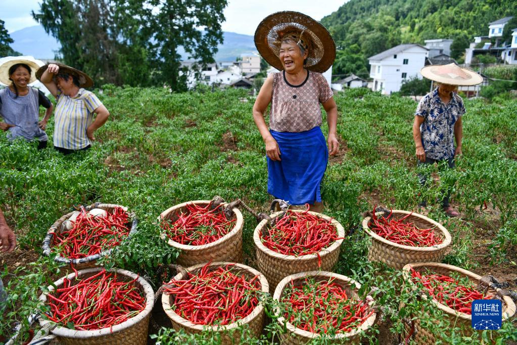 村民在貴陽農(nóng)投集團奇申蔬菜基地采收牛角椒(7月29日攝)。新華社記者 陶亮 攝