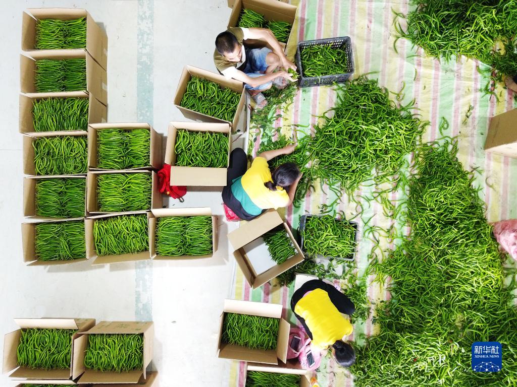 農(nóng)民在貴州省榕江縣車江壩區(qū)的蔬菜采選場分選辣椒(2020年6月2日攝,無人機照片)。新華社記者 楊文斌 攝